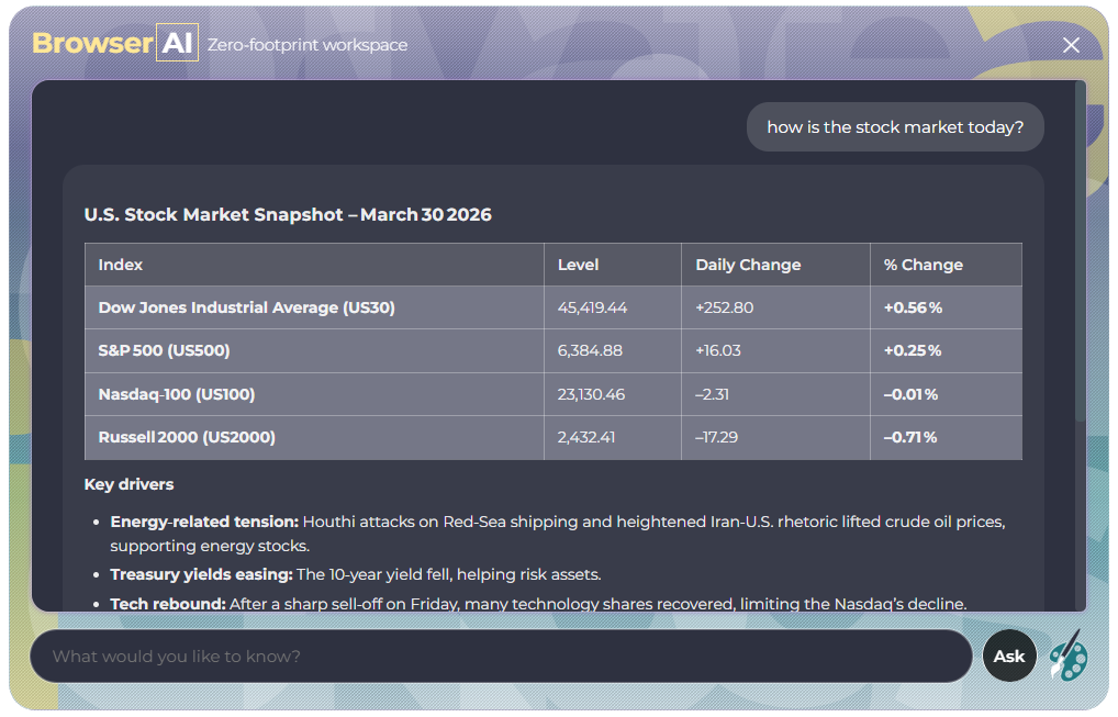 Browser AI brings an on-demand AI interface directly into your current webpage, eliminating tab switching and copy-paste workflows. Its zero-footprint design appears only when needed and disappears when you’re done, keeping your browser fast, private, and distraction-free.