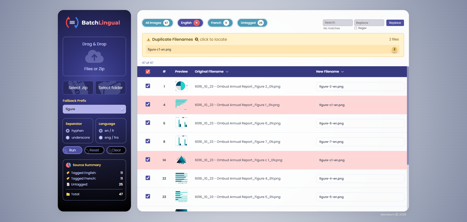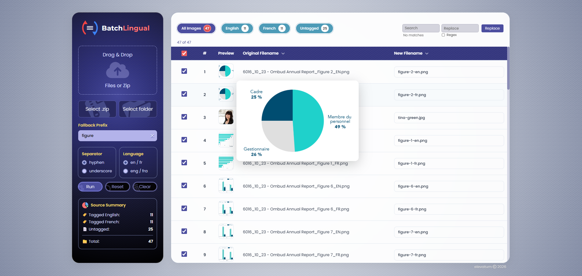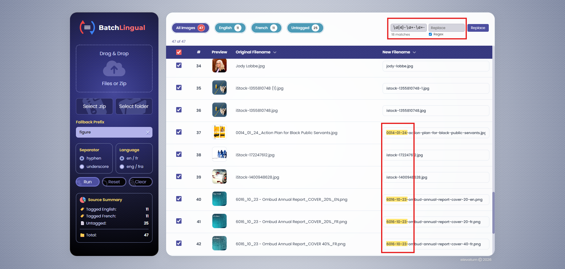 BatchLingual is a batch image renaming tool built for bilingual (English/French) file naming conventions. It helps transform messy, inconsistent filenames into clean, standardized outputs using structured naming rules.