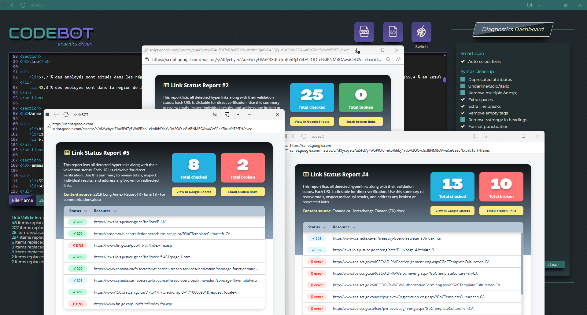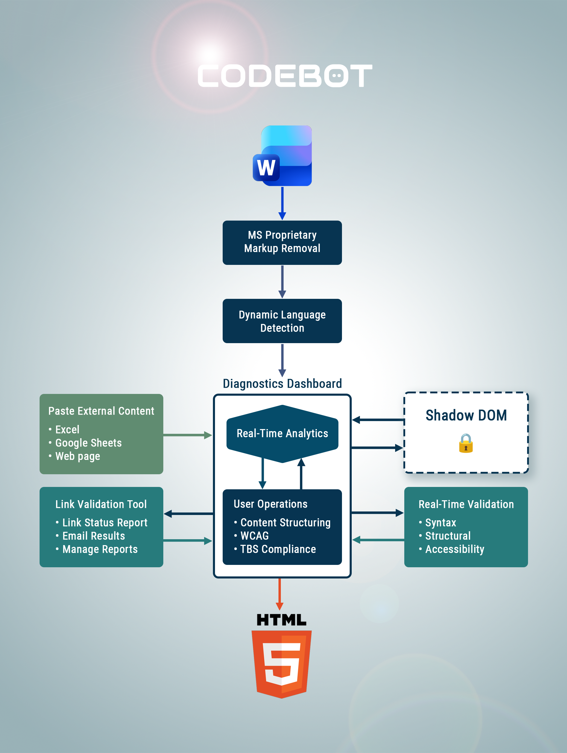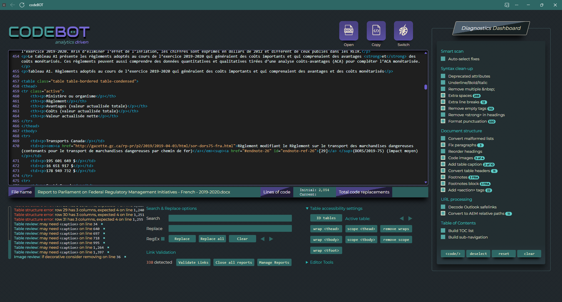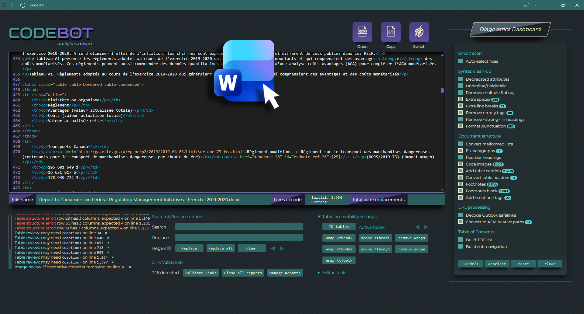 <clause> elementsAnalytics-driven automated HTML editor that opens Word documents of all sizes while applying the Canadian Standard on Web Accessibility. CodeBOT combines a sequential processing pipeline from core syntax cleanup to content structuring, streamlining the conversion workflow and supporting WCAG compliance.