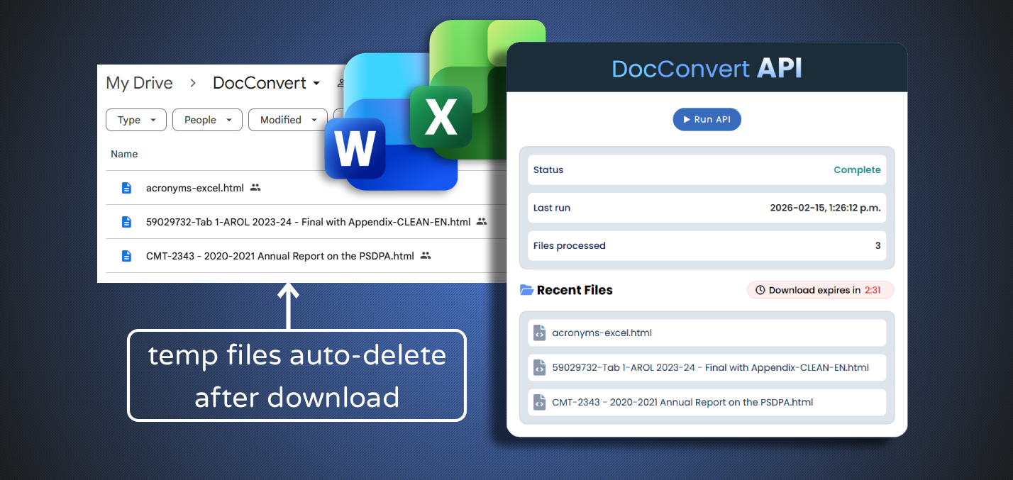 A serverless API that converts Word documents (DOCX) and Excel spreadsheets (XLSX) into HTML instantly, delivering results immediately through a dashboard or via email, all without deploying servers.