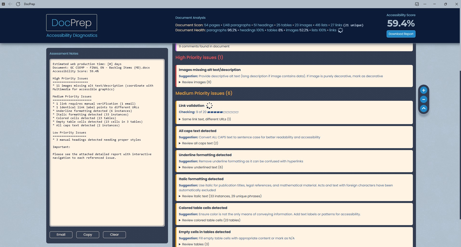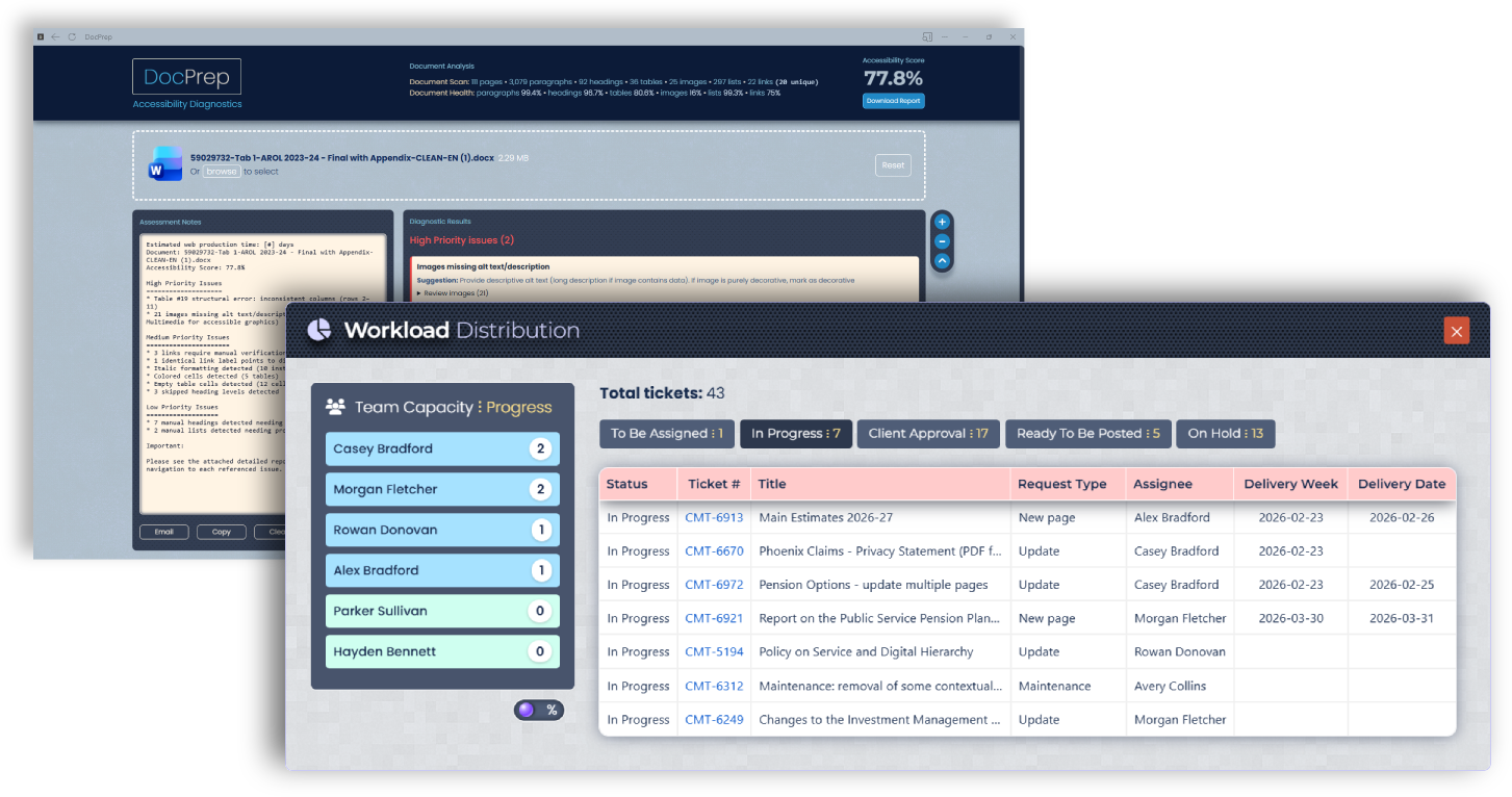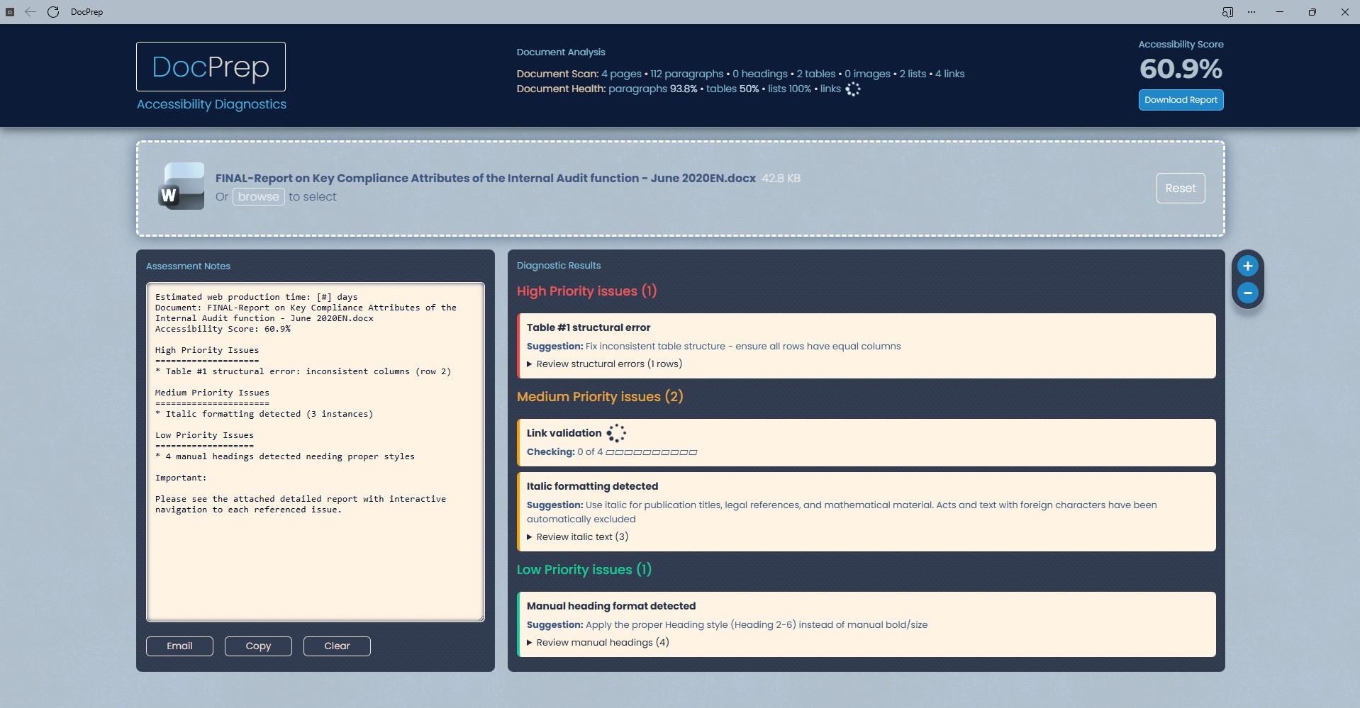 Watch on YouTubeAn application that provides pre-production analysis of Microsoft Word documents, identifying accessibility and structural issues while delivering actionable diagnostics through automated validation and accessibility scoring.