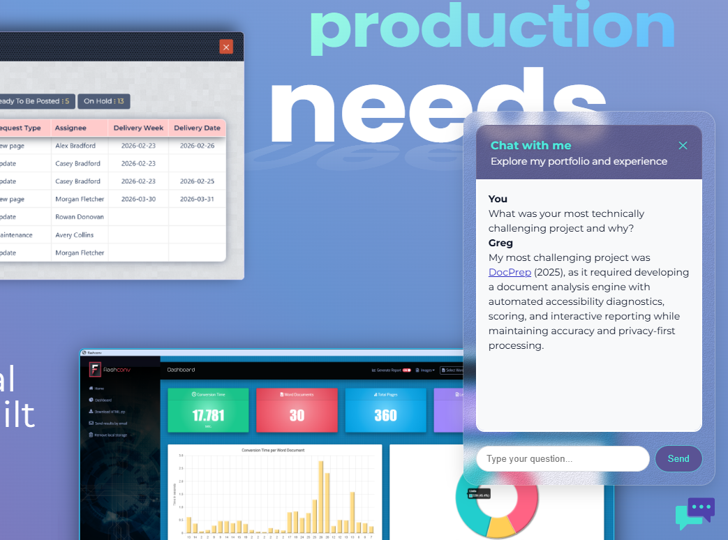 A client-side AI chatbot integrated into the portfolio that guides users through projects, answers technical questions, and provides context-aware, real-time responses without server dependencies.