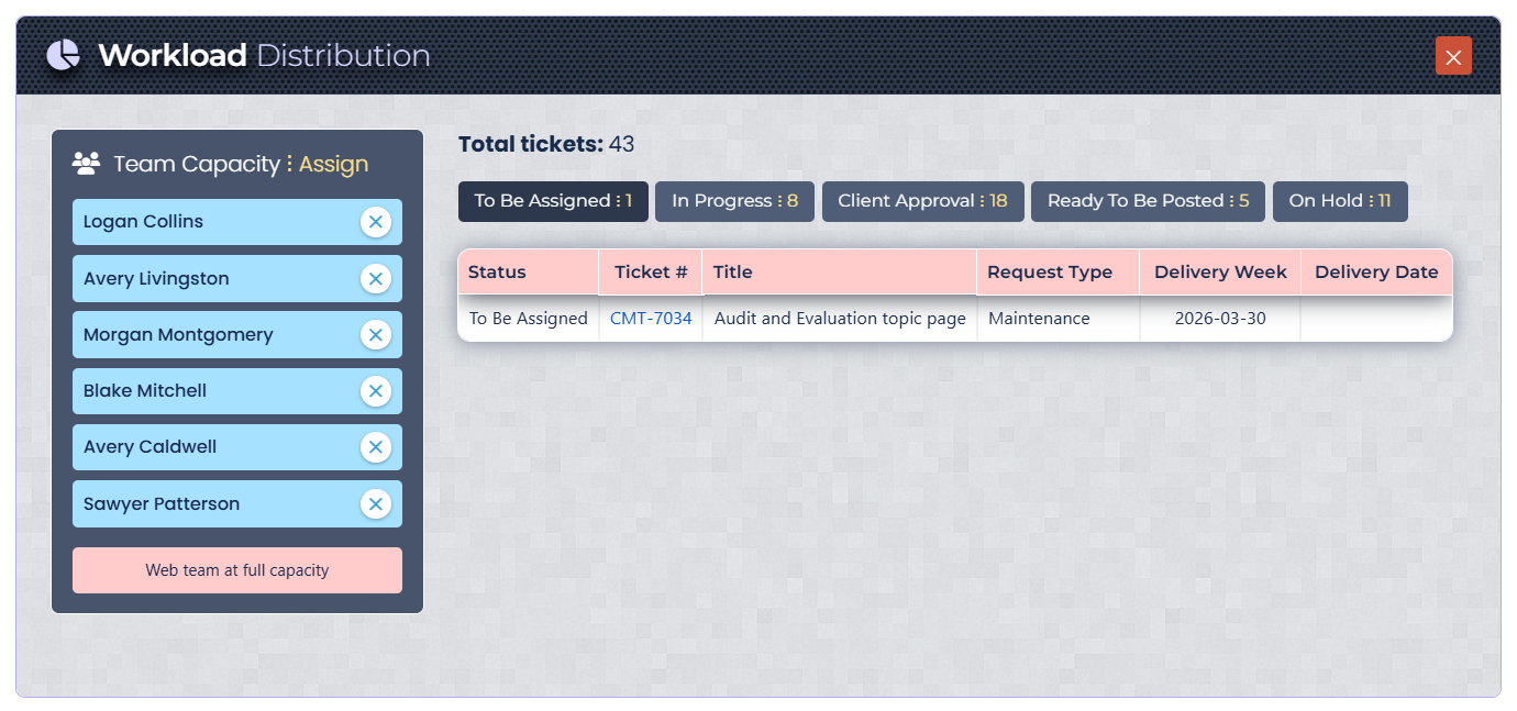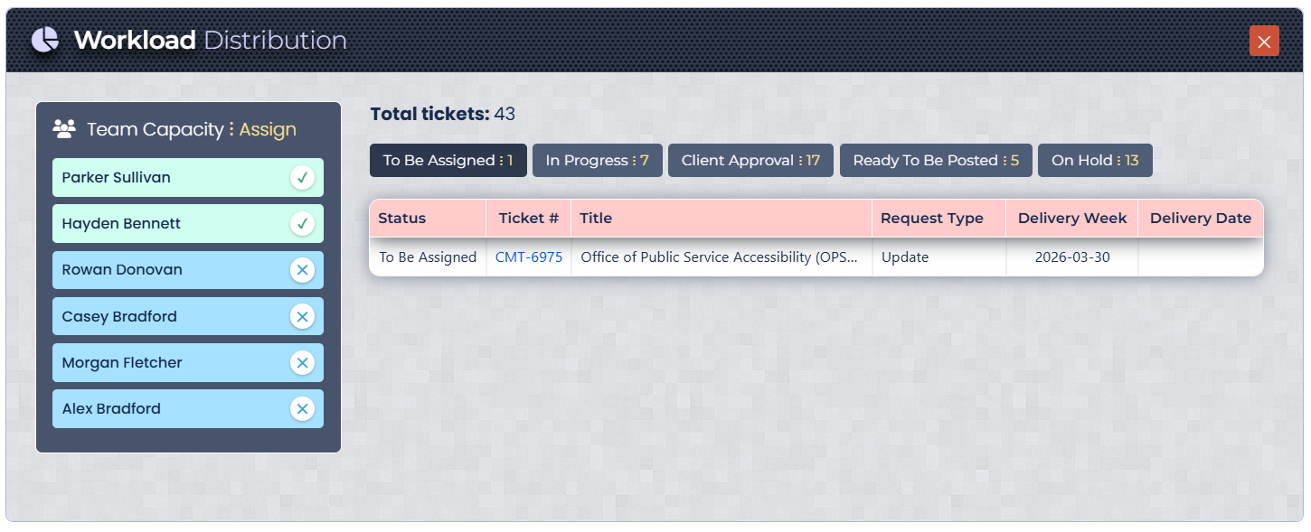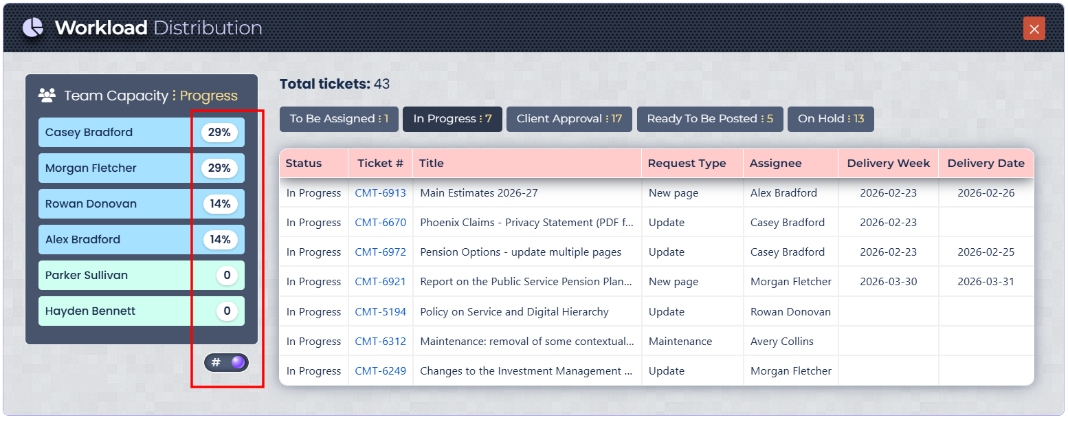 A real‑time dashboard that extracts and visualizes team workload directly from a Jira project view. It consolidates paginated ticket data into a single interactive panel, providing instant visibility into how work is distributed across the team and who has available capacity.