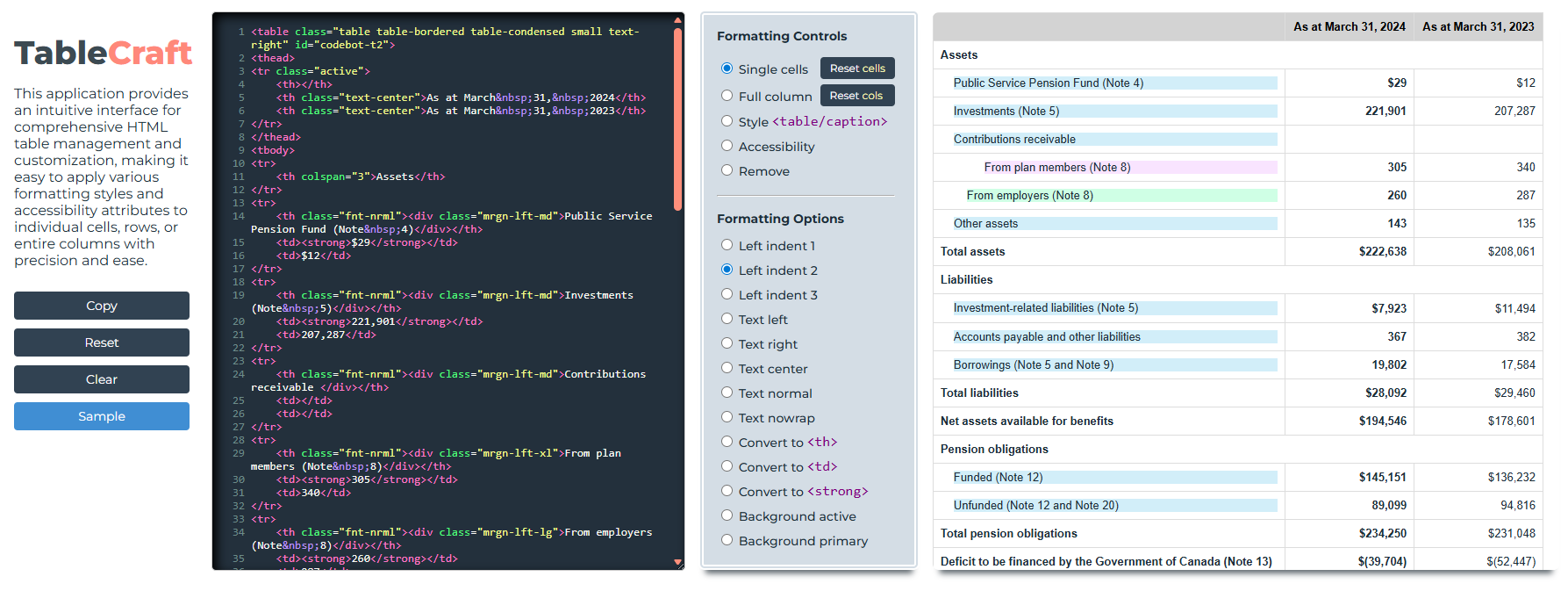 Originally designed with financial data in mind, this tool provides a graphical interface for editing and customizing HTML tables. It enables quick styling and structural changes, while also managing accessibility attributes without the need to write HTML code.