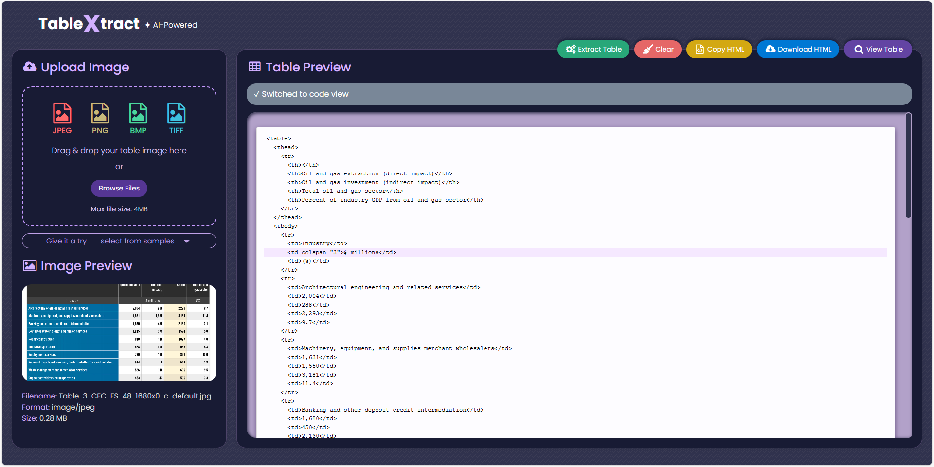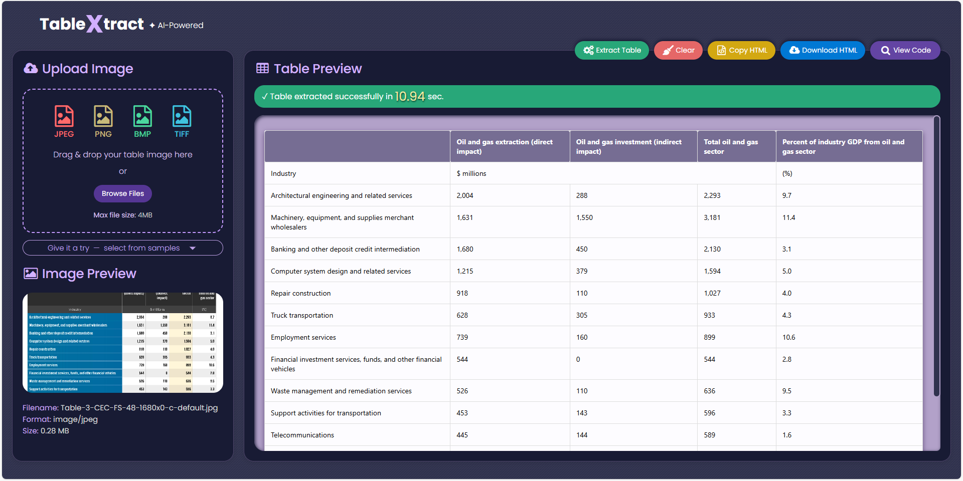 Cloud-based microservice that converts table images into structured HTML. It accepts binary image uploads, performs server-side OCR and table detection, and returns clean, standardized output ready for downstream automation. The service runs in both local and web-based environments, delivering fast and consistent results. Built as a scalable, serverless component, TableXtract can be easily integrated into existing applications and workflows that require accurate table extraction from screenshots, scans, or other image sources.
