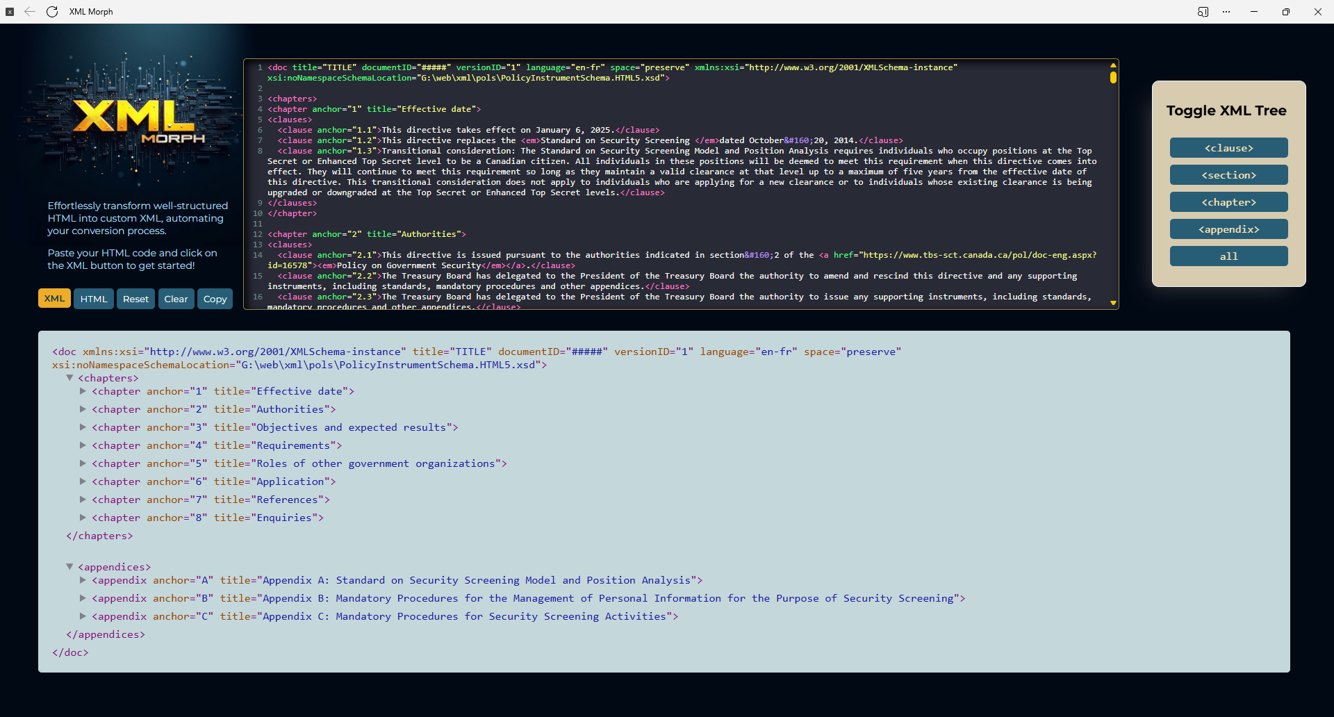 This tool effortlessly transforms well-structured HTML into custom XML format used in TBS policy documents, streamlining the conversion process.